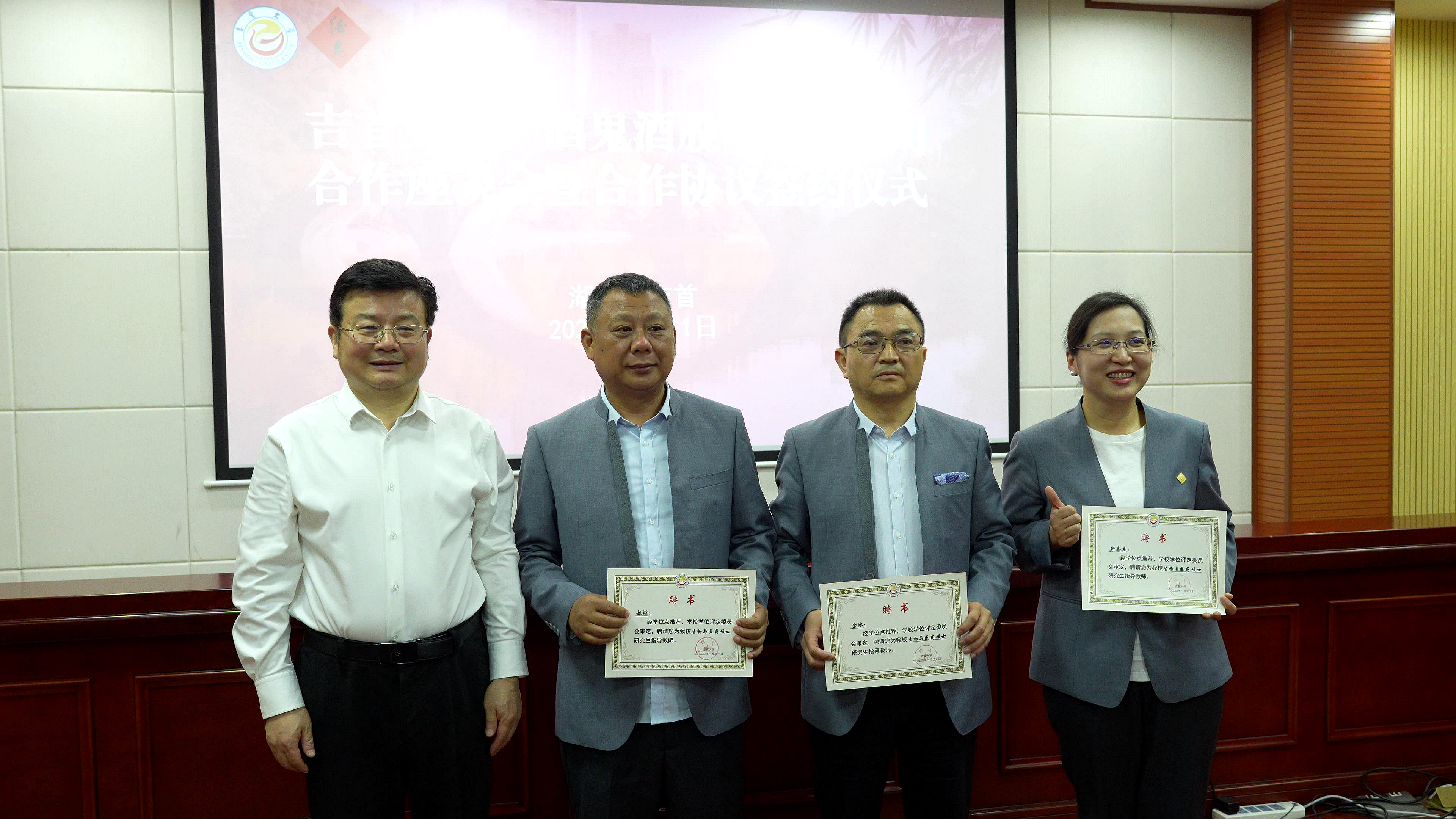 冷志明与李文生代表双方签订了《合作框架协议》《奖学金、助学金捐赠协议》。冷志明为酒鬼酒公司余冰、赵湖、靳喜庆3位导师颁发硕士生导师聘书。